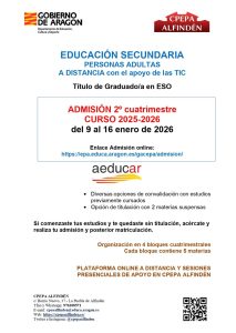 Desde el día 9 hasta el 16 de enero está abierto el periodo de admisión para las enseñanzas de Educación Secundaria para Personas Adultas a Distancia (ESPAd). Es importante obtener plaza a través del proceso de admisión, aunque en febrero se abrirá un periodo de matrícula extraordinario para quien no haya hecho el proceso, si …